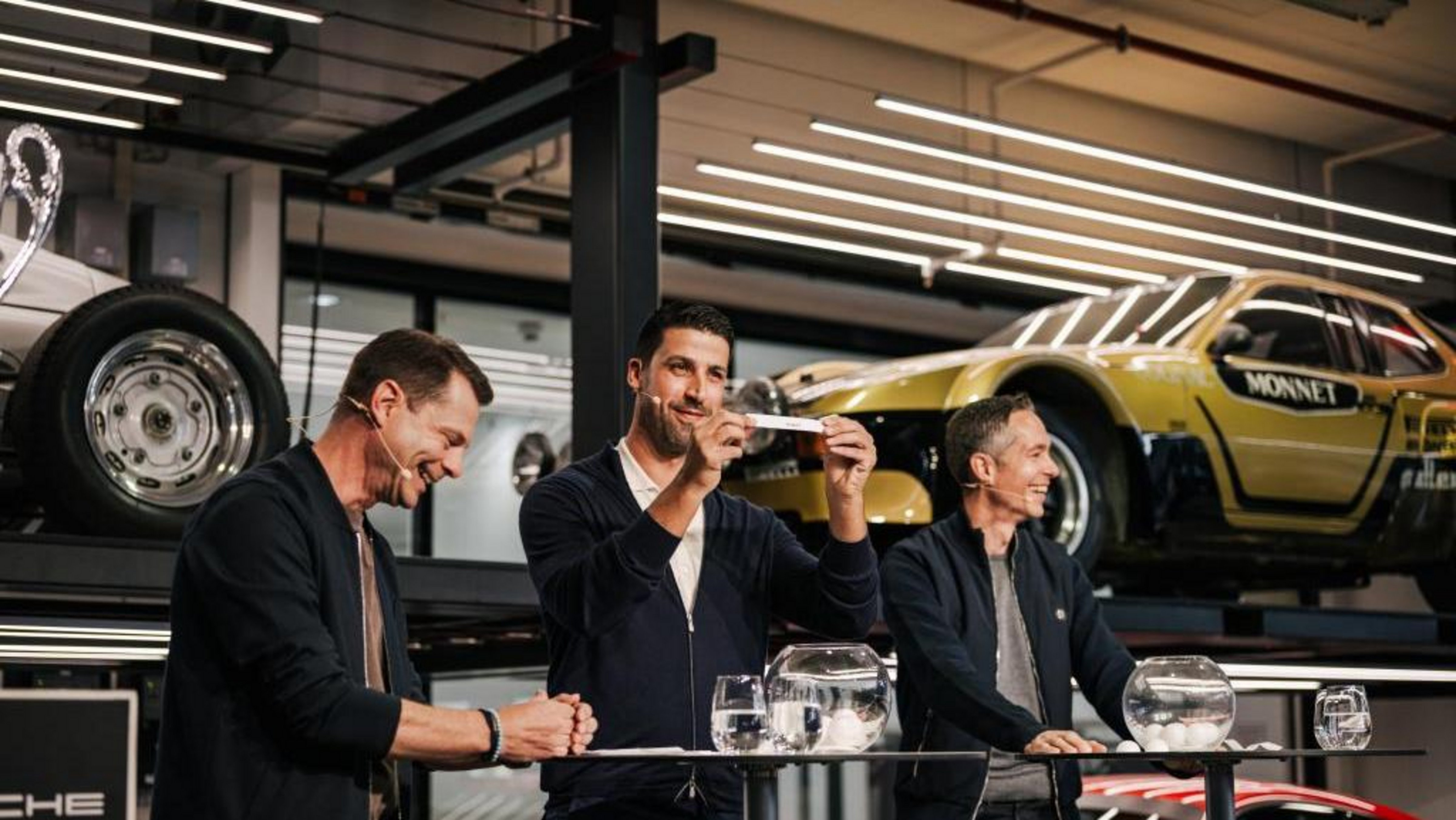 Porsche Fußball Cup 2025: Porsche-Markenbotschafter Sami Khedira (m.) und Dr. Sebastian Rudolph, Leiter Öffentlichkeitsarbeit, Presse, Nachhaltigkeit und Politik (r.)