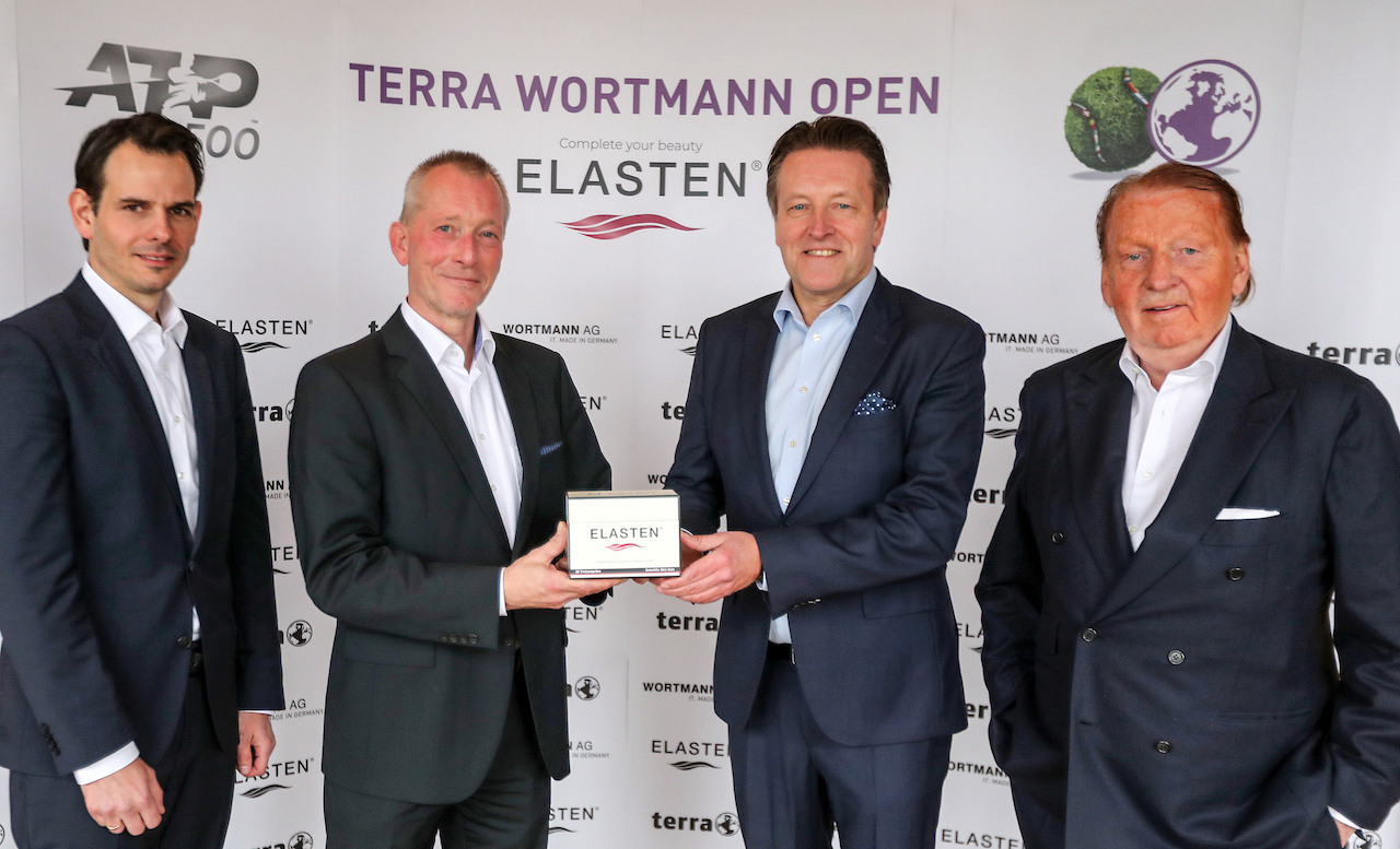 Dr. Jan-Christoph Kattenstroth, Dr. Peer Lange (beide Geschäftsführer QUIRIS Healthcare), Ralf Weber (Turnierdirektor und geschäftsführender Gesellschafter OWL ARENA) und Hauke Thoma (CEO & Founder Quiris Healthcare) präsentieren das Trink-Kollagen ELASTEN. © TERRA WORTMANN OPEN (honorarfrei)