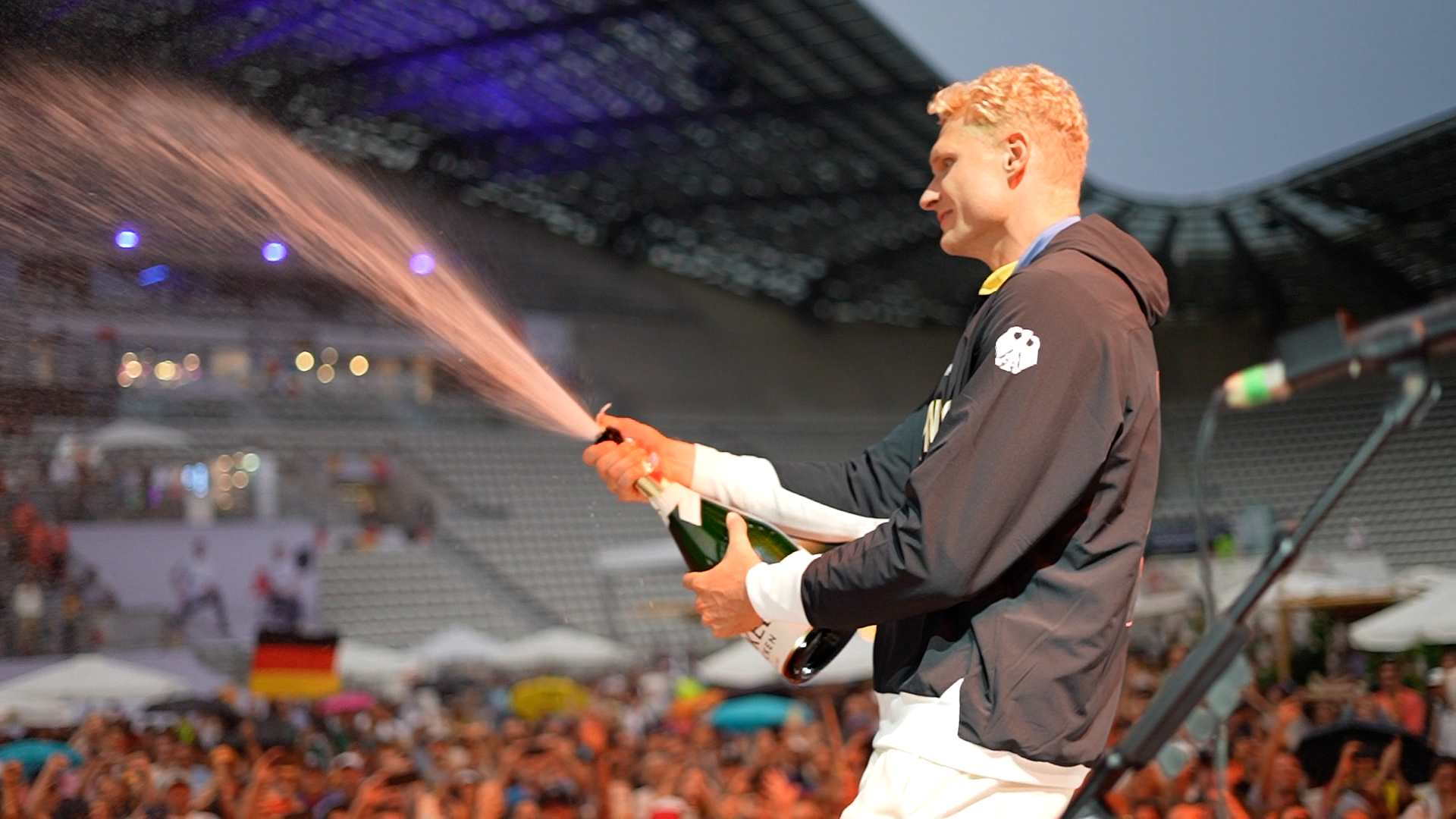 Sektdusche für die Fans: Oliver Zeidler feiert feucht fröhlich