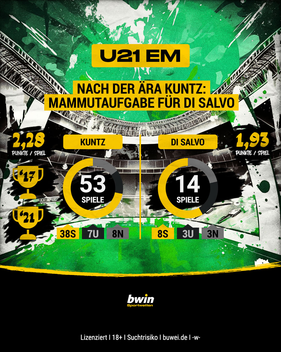 Ins Auftaktspiel bei den Titelkämpfen in Georgien und Rumänien geht das Team von U21-Bundestrainer Antonio di Salvo am Donnerstag (22. Juni, 18.00 Uhr MESZ) mit Sieg-Quote 1,31 als klarer Favorit. Dass Gegner Israel die deutschen Youngster besiegen kann, hält bwin mit Quote 8,50 für unwahrscheinlich.