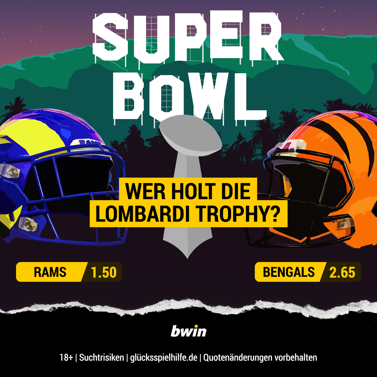 Legt Underdog Cincinnati Bengals aus Ohio in der Nacht auf Montag (14. Februar, ab 00.30 Uhr MEZ/live auf ProSieben und DAZN) erstmals die Hand an die begehrte Vince Lombardi Trophy, zahlt bwin das 2,65-Fache des Einsatzes zurück.