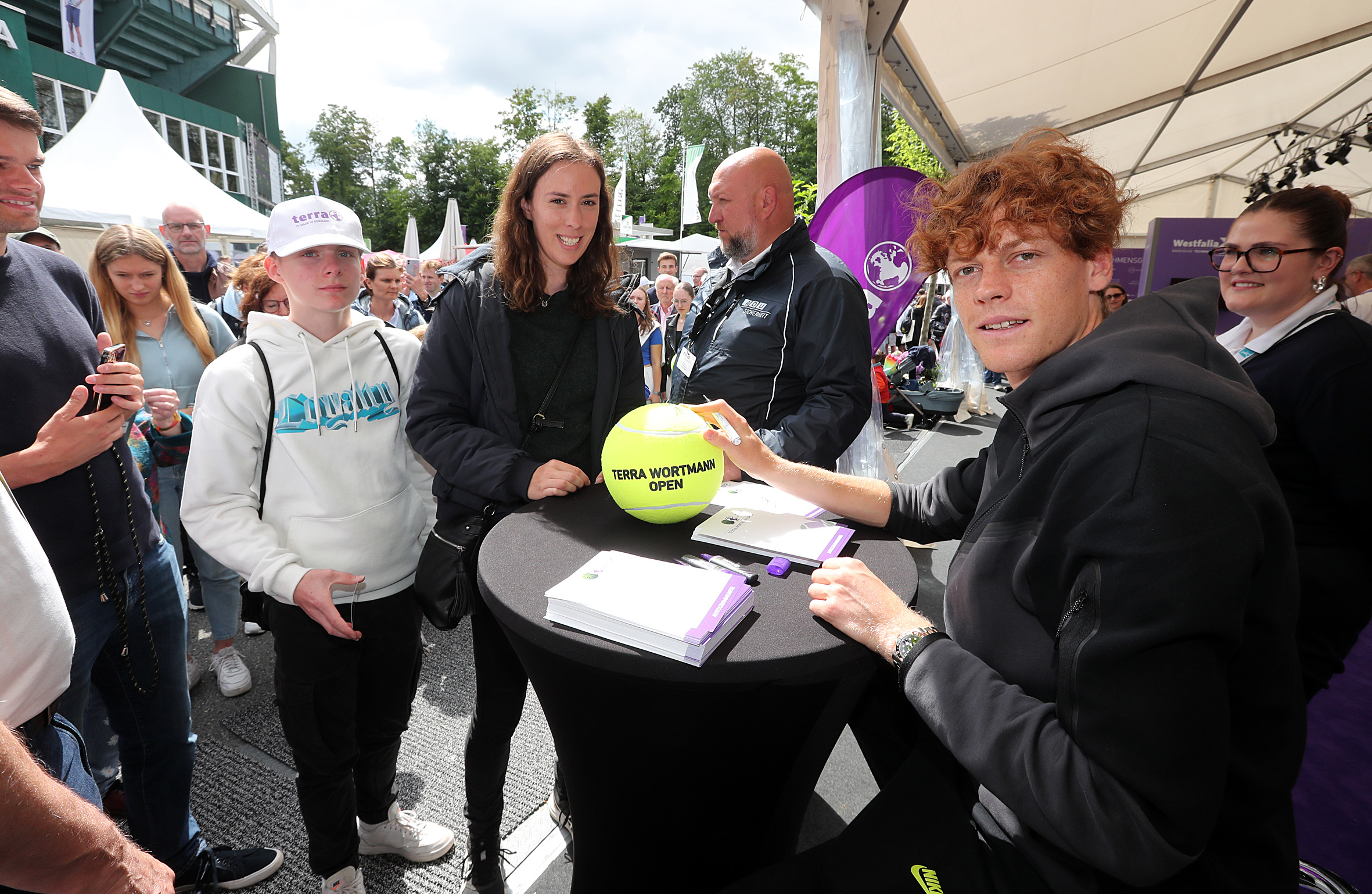 Bildzeile (Sinner, Jannik): ATP-Spitzenmann Jannik Sinner nahm sich am Stand von Titelsponsor Wortmann geduldig Zeit für die Autogramm- und Selfiewünsche der zahlreichen Fans. © TERRA WORTMANN OPEN (honorarfrei)