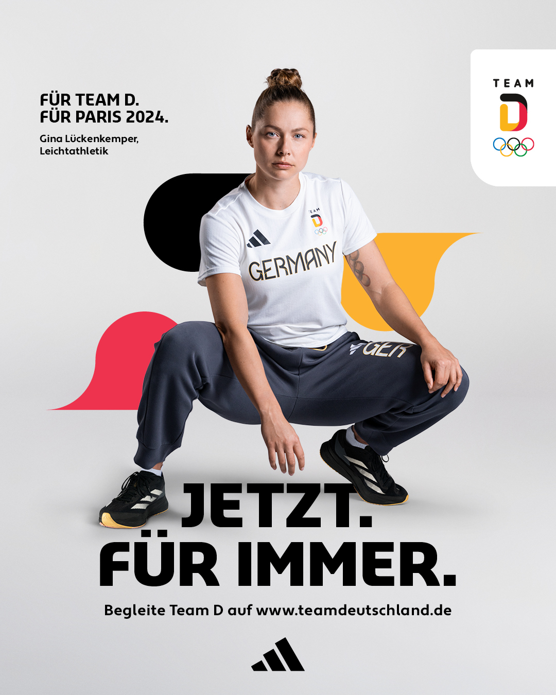 Ziel der Kampagne ist es einmal mehr, bei den Menschen Aufmerksamkeit für die olympischen und paralympischen Athlet*innen zu generieren, die als Beste ihrer Disziplin für Deutschland bei den Spielen antreten. Dabei zahlt der Claim „Jetzt. Für immer.“ besonders auf zwei Aspekte ein: auf den Willen der Athlet*innen, für diesen einen Moment voll fokussiert und bereit zu sein sowie auf das Vertrauen darauf, dass das dort Erlebte ein Leben lang in Erinnerung bleibt. Die Sportler*innen schreiben dabei nicht nur ihre eigene Geschichte, sondern auch die von Team Deutschland weiter. Zudem bezieht das Motto die Fans mit ein, denn auch diese können aus dem im „Jetzt“ verfolgten Geschehen viel Begeisterung und Emotionen mitnehmen, die ihnen „für immer“ im Gedächtnis bleiben und sie nachhaltig inspirieren.