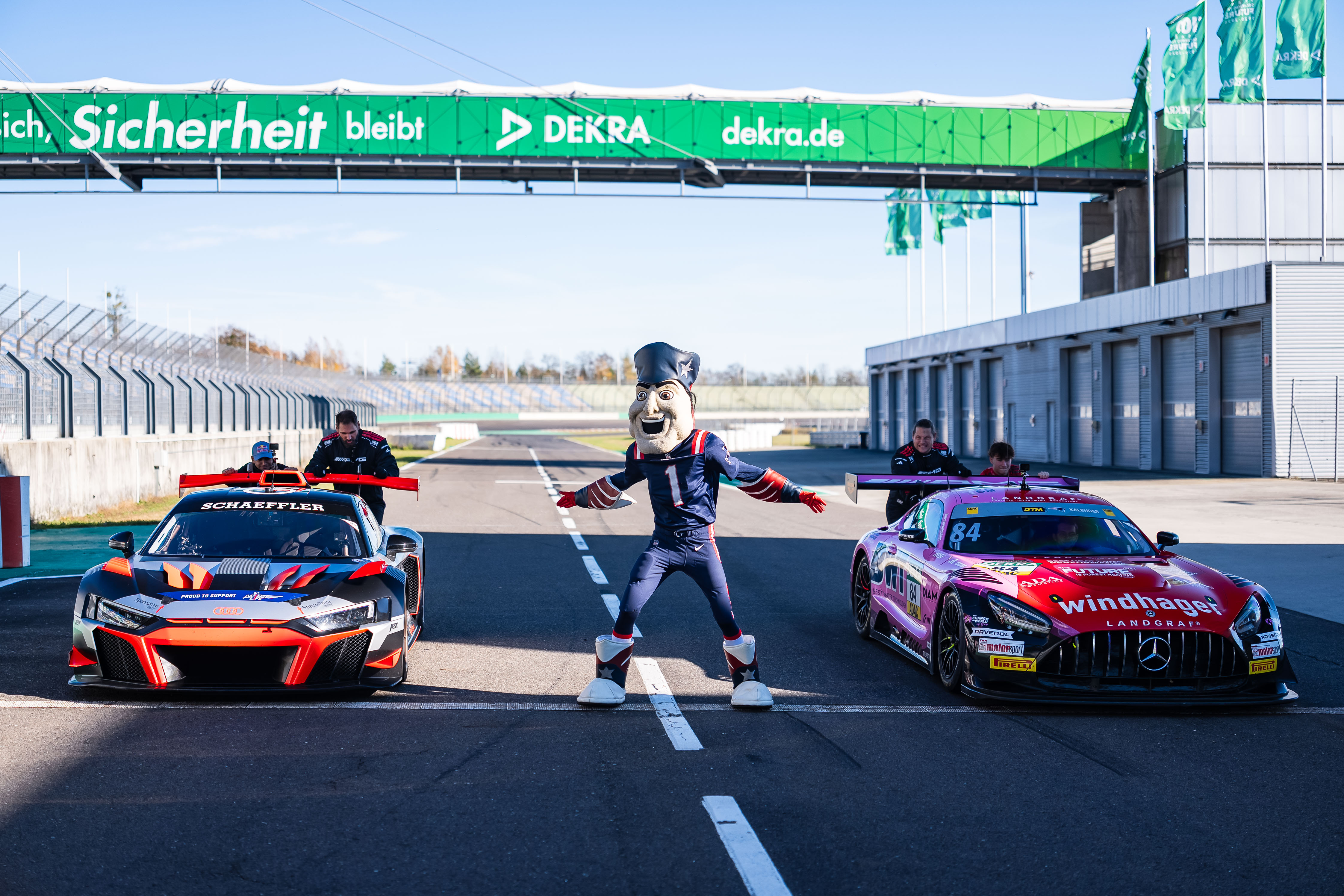 Motorsport trifft auf American Football: Bevor die NFL (National Football League) am 9. November erstmals ein reguläres Saisonspiel im Berliner Olympiastadion austrägt, sorgten die DTM und die New England Patriots am Donnerstag für die perfekte Einstimmung. Beim „Motorsport meets American Football Day“ auf dem Dekra Lausitzring trafen DTM-Champion Ayhancan Güven (TR/Manthey EMA) und Youngster Tom Kalender (Hamm/Sieg) vom Mercedes-AMG Team Landgraf auf die beiden deutschen NFL-Legenden Sebastian Vollmer und Markus Kuhn sowie den dreimaligen Super-Bowl-Sieger Lonie Paxton aus den USA. Im Rahmen der neuen Partnerschaft mit den Patriots, dem Rekordchampion der NFL, standen verschiedene Medienaktivitäten und Renntaxifahrten auf dem Programm.