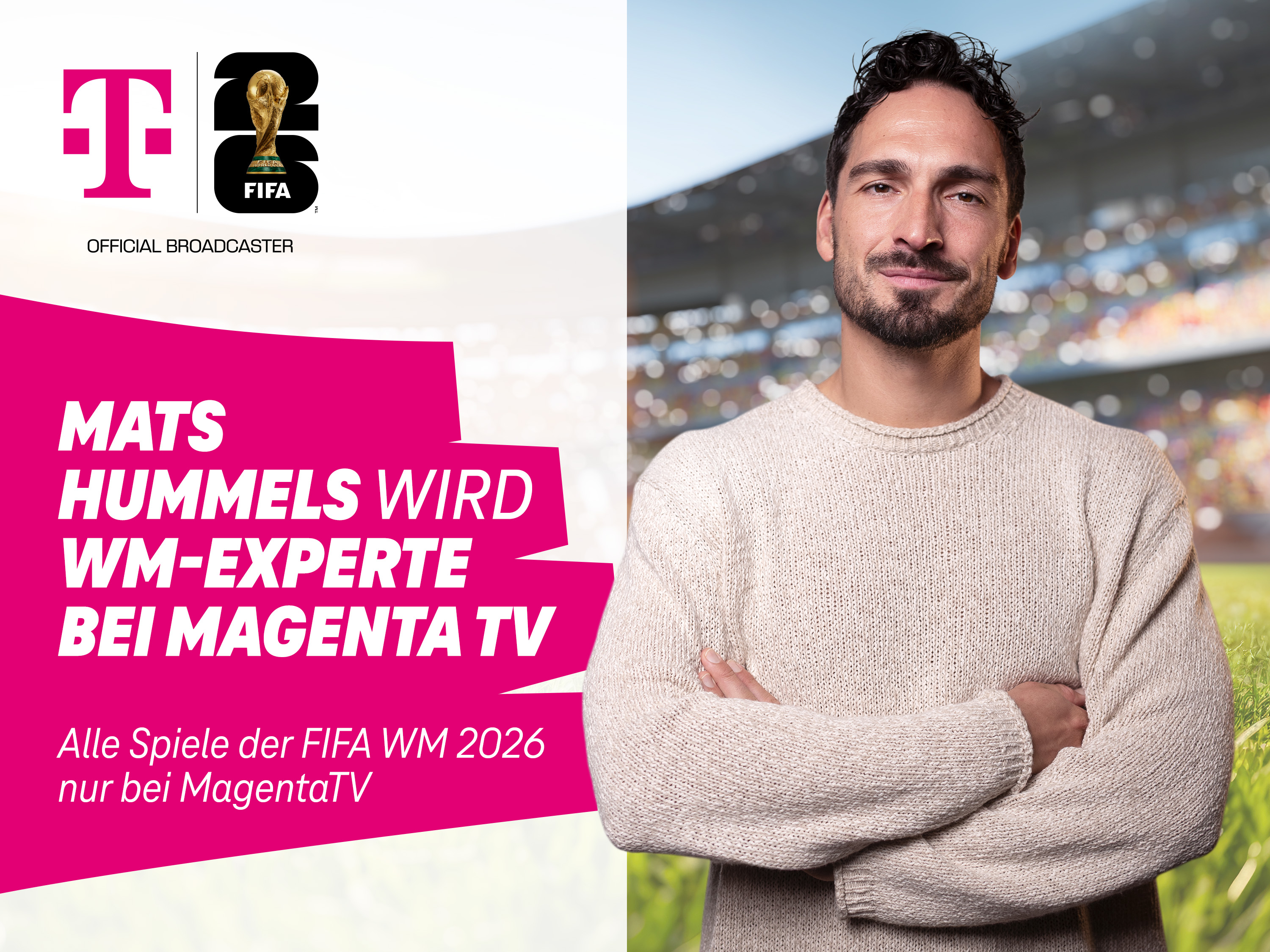 MagentaTV hatte das Top-Experten-Triple zur FIFA WM 2026 am Donnerstagmorgen verkündet: Weltmeister Mats Hummels verstärkt das Team um Thomas Müller und Jürgen Klopp und wird sein Fachwissen bei der WM 2026 in den USA, Kanada und Mexiko einbringen. Fußball-Fans bekommen nun noch mehr geballte Kompetenz, humorvolle Betrachtungen und fundierte Analysen. Die Experten-Konstellation Müller, Klopp und Hummels ist einmalig in der deutschen TV-Landschaft.