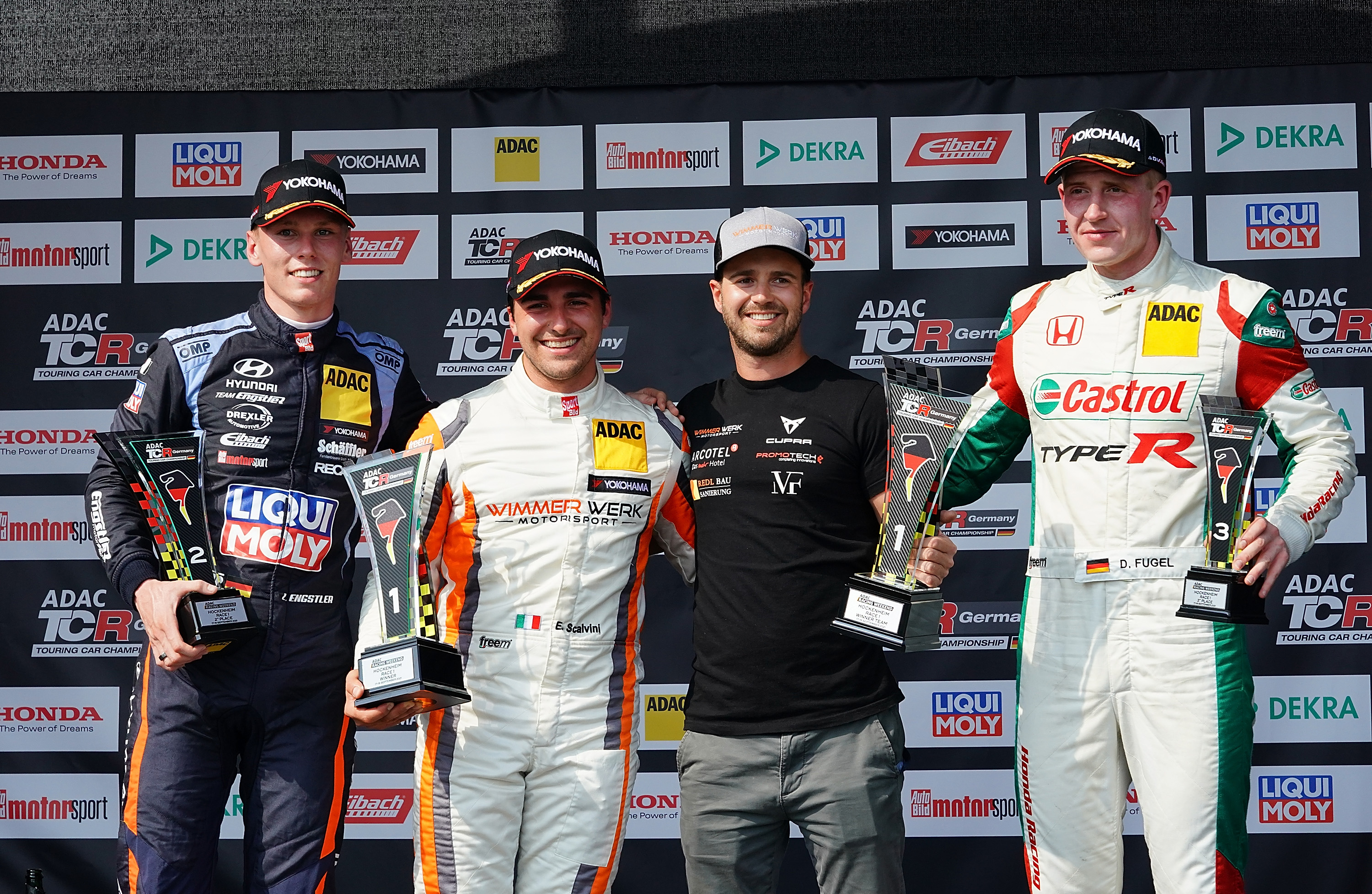 An der Spitze blieb die Reihung bis zum Rennende gleich. Scalvini gewann nach 17 Runden mit 2,877 Sekunden Vorsprung vor Engstler und Dominik Fugel. Hinter Andersen fuhr Hyundai Team Engstler-Teamkollege Nico Gruber (20, AUT) im Hyundai auf Platz fünf und gewann somit die Honda Junior Challenge. Rang sechs ging an Jonas Karklys (32, LTU, NordPass) in einem weiteren Hyundai vor Markenkollege Roland Hertner (61, Heilbronn, Hyundai Team Engstler), der gleichzeitig auch die Trophy-Wertung für sich entschied. Achter wurde Peter Gross (51, AUT, Wimmer Werk Motorsport) im Audi RS3 LMS TCR vor Robin Jahr (30, Blankenfelde, ROJA Motorsport by ASL Lichtblau) im Hyundai. Die Top Zehn komplettierte Cupra-Pilot Christian Voithofer (43, AUT, Wimmer Werk Motorsport). Auf dem Hockenheimring folgt am Sonntag ab 13:30 Uhr noch das zweite Rennen der ADAC TCR Germany, welches auf adac.de/motorsport und auf youtube.com/adac im Livestream übertragen wird.