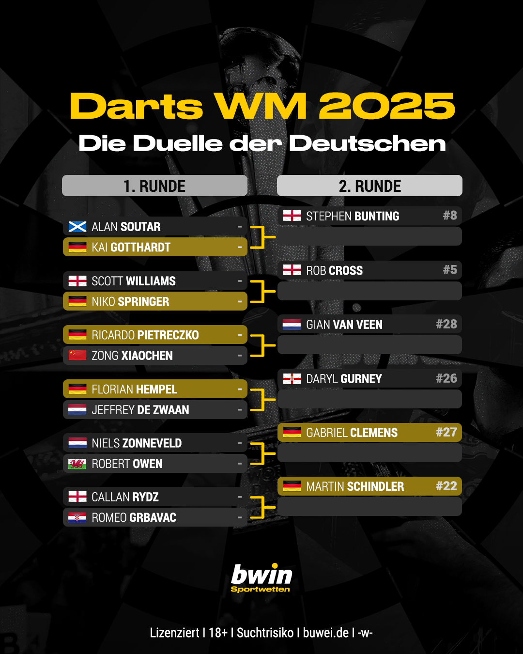 Während beide als gesetzte Spieler erst in Runde zwei ins Turnier starten, müssen sich ihre Landsleute von Beginn an beweisen. Ricardo "Pikachu" Pietreczko, der im vergangenen Jahr den späteren Sieger Humphries an den Rand einer Niederlage gebracht hatte, geht am 17. Dezember mit Quote 1,10 als klarer Favorit in seine Auftaktpartie gegen den Chinesen Chen Zong Xiao (Quote 6,50).