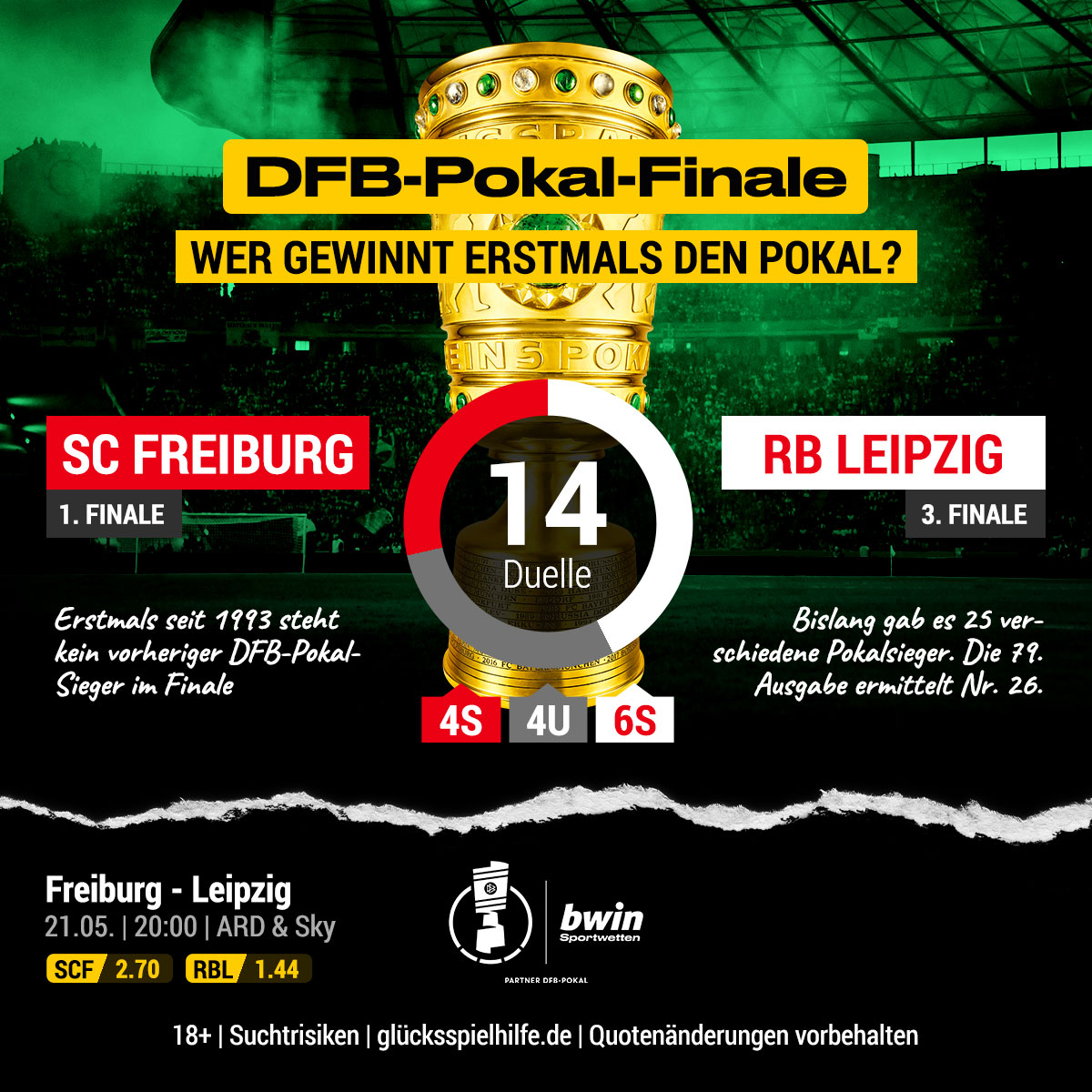 Nach dem Triumph im Bundesliga-Fernduell um den letzten Champions-League-Platz entscheidet Leipzig laut bwin am Samstag auch das direkte Duell gegen die Final-Debütanten aus dem Breisgau (Quote 3,75) mit einer Sieg-Quote von 2,00 zu seinen Gunsten.