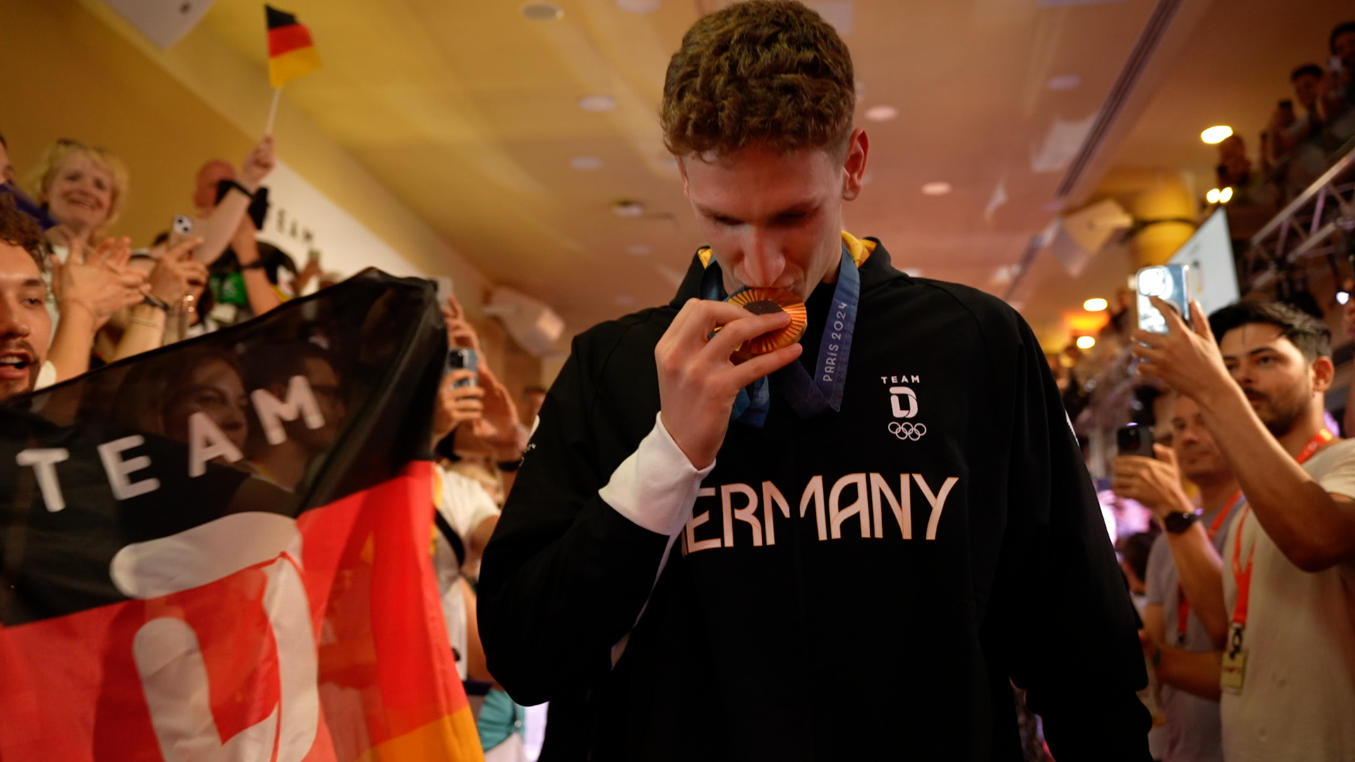 Besuch des Olympiasiegers Lukas Märtens: Der 22-Jährige feiert im Deutschen Haus seine Goldmedaille über 400 Meter Freistil. Nachdem Märtens in der Zwischenzeit in weiteren Wettkämpfen an den Start gegangen ist, ist es sechs Tage nach seinem Erfolg Zeit für seinen Medal Walk.